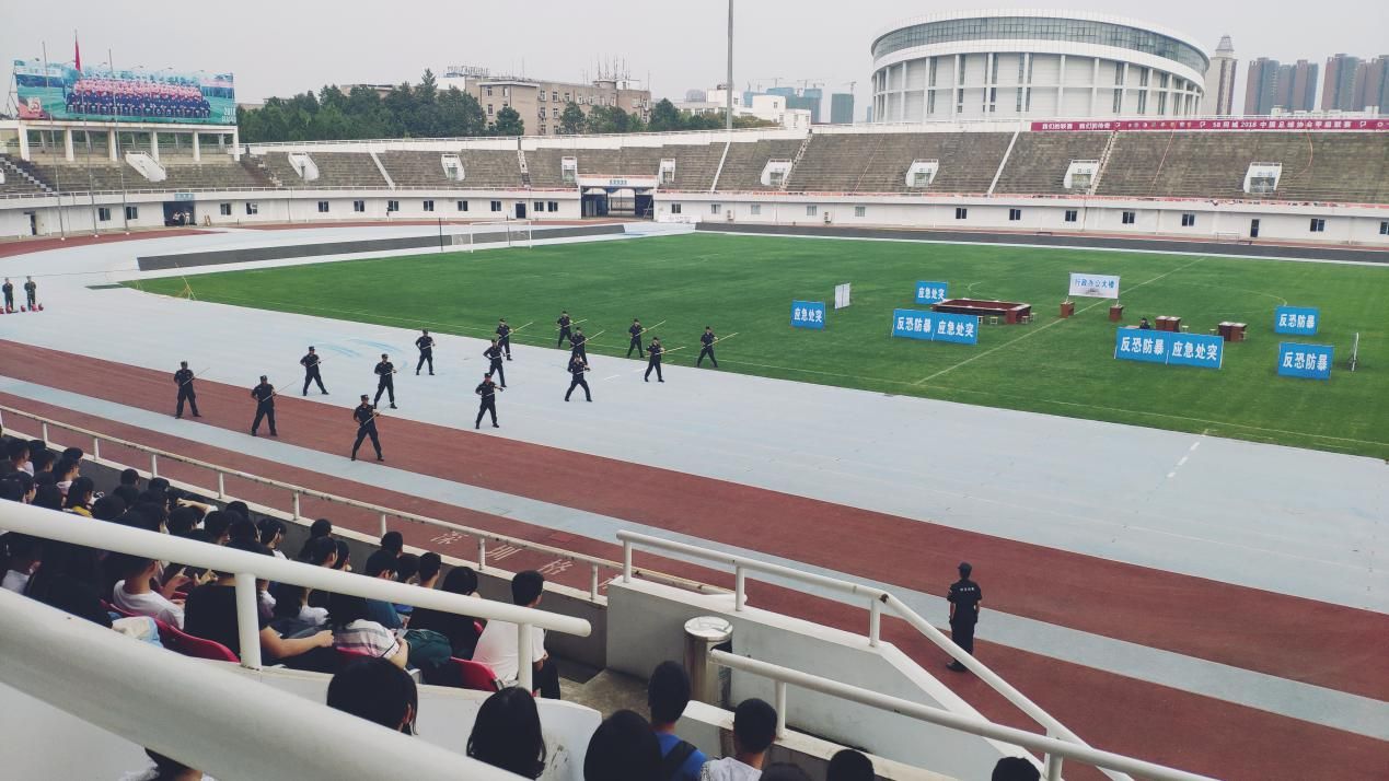 本次演练活动,万清祥书记作动员讲话,校保卫部、宣传部、东新公安消防民警85人参演,学校各院系及后保部门代表约2000人现场观摩。演练分为两个部分,一是应急处突装备、技能展示;二是模拟警情处置。在演练的第一部分中,我校20名校卫队特勤队员进行了应急棍术演示和综合格斗术演示,12名东新消防大队队员进行了消防装备展示和五盘水带链接演示。演练的第二部分中,十余名校外经营户在我校行政办公楼聚众示威、封堵办公楼通道,校保卫部和公安干警到达现场后及时处置,将经营户强制带离。随后,经营户亲属携带管制刀具、液化气罐和酒精瓶冲至现场,点燃液化气罐并向办公楼抛出酒精瓶。公安趁机将持械者制服,特勤队员迅速疏散楼内教职工,消防队员扑灭火焰。至此,警情解除。参演人员精神抖擞,模拟场景环环相扣,受到观摩的领导及师生一致好评,现场欢呼声和掌声不断。