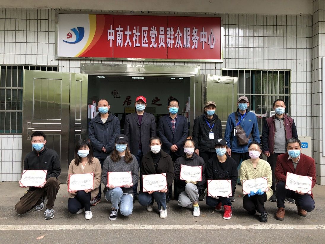 4月14日,首义路街中南大社区举办了一场具有特殊意义的活动:为下沉干部颁发抗疫保障荣誉证书,联和社区对口帮扶支部——武汉市统计局数应中心支部慰问新冠肺炎感染康复病人。武汉统计局机关党委书记王珊、数应中心支部书记夏钧,首义路街党工委副书记邓延颖、副主任张林,校保卫部部长胡海南、副部长姚荧玖,社区书记徐飞及社区工作人员等人一起参加了活动。