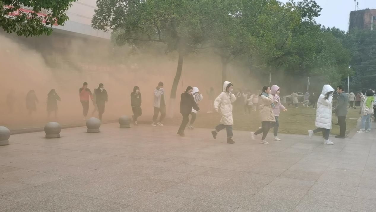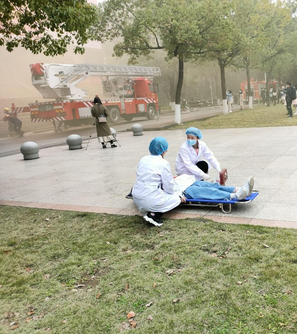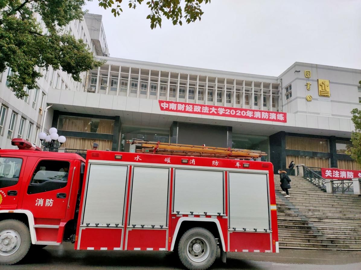 演习开始时,硝烟四起,烟雾弥漫,首义图书馆顿时笼罩在重重烟雾之中,若隐若现。在场人员立即拨打了报警电话。随后,一辆辆紧急消防车赶往现场。急促的警报声循环拉响,勾紧了每一个人的心弦。在指导员指挥下,同学们手捂口鼻,从图书馆里迅速有序地逃离“火灾现场”。消防人员手持水管冲向楼内,开展扑灭火灾的扑救工作,医疗救助队抬着担架,紧急奔向浓浓的烟雾中……指导员对各种不同功能的消防车逐一作了详细介绍:抢险救援车,主要负责抢救火灾中的被困人员及楼内人群中的疏散;32米登高平台消防车和云梯消防车,主要负责高楼层火势控制等。医疗救援队在保卫队人员的帮助下成功救出受伤学生,迅速撤离到安全地段实施救助。消防救援人员使用三支水枪和云梯消防车对火势进行了有效控制。