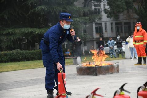 在油内灭火环节中,消防救援人员现场向现场的师生讲解了灭火器的正确使用方法,指导部学生使用手提式干粉灭火器扑灭了模拟的木材火。