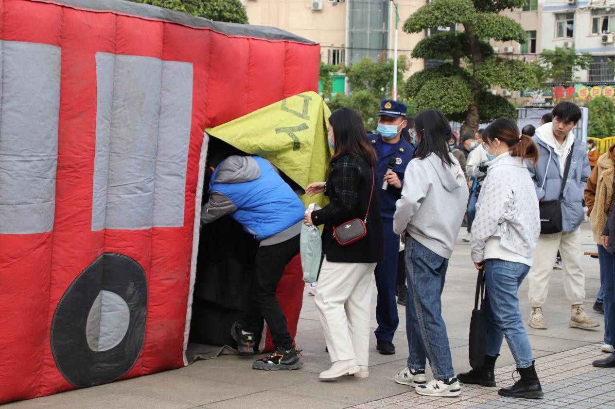 在模拟火场逃生帐篷体验环节,医护人员捂住口、鼻,弯腰低头依次从“帐篷”入口进入,并按照引导快速撤离。真真切切让大家体验在浓烟、黑暗的空间内如何快速有效的安全逃生。