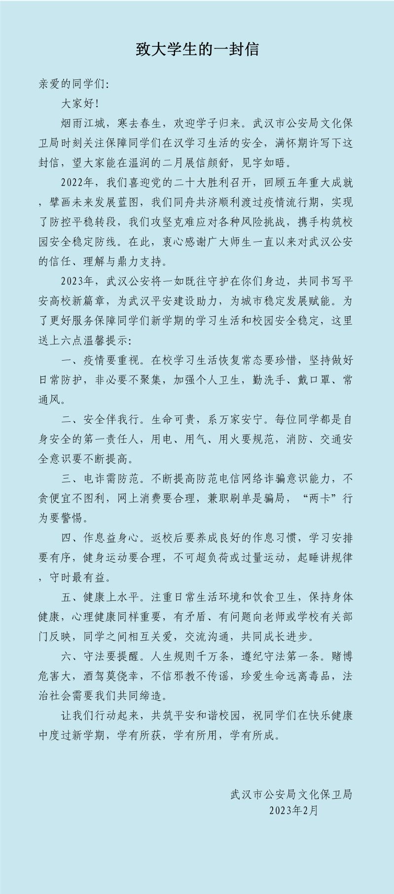 武汉市公安局文化保卫局: 致大学生的一封信