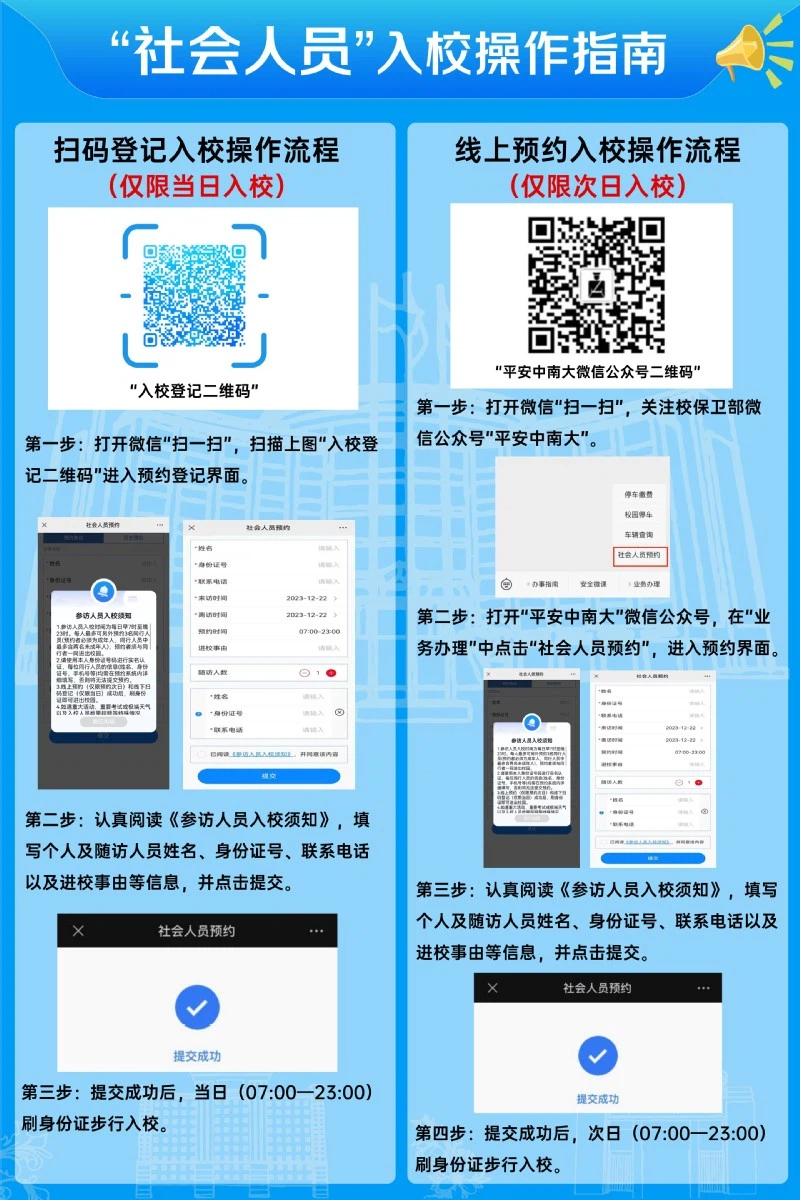 4.如遇重大活动、重要考试或极端天气以及入校人员数量超额等特殊情况,暂停预约功能。社会公众可关注平安中南大微信公众号及时了解相关信息提示。